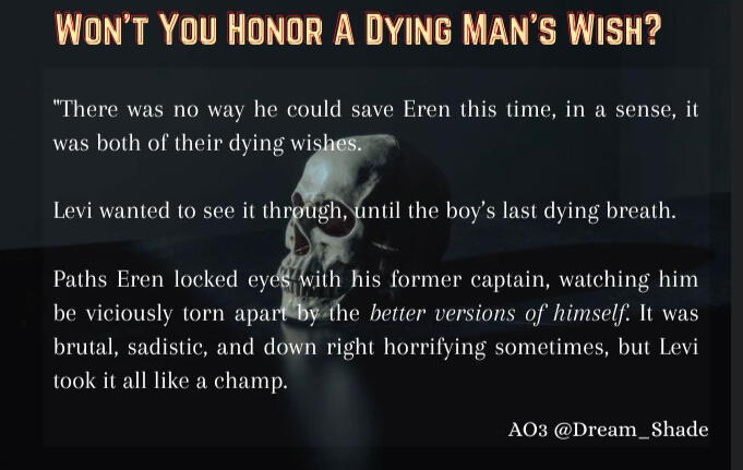 Won't You Honor A Dying Mans' Wish?Won't you honor his last wish, Levi? Was it ever true love if you didn't?A oneshot about Levi and Eren's last time together intimately.