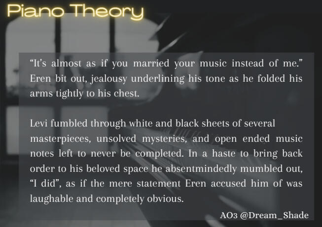 Piano TheoryWhen artistry is too beautiful, how can one love another?A drabble about pianist Levi and his painter husband, Eren, getting into an argument over Levi’s mental health and toxic work habit.