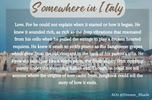 Love. For he could not explain when it started or how it began. He knew it sounded rich, as rich as the deep vibrations that resonated from his cello when he pulled the strings to play a broken hearted requiem. He knew it smelt so sickly potent as the Sangiovese grapes which grew from the old vineyard in the back of his parent’s villa. He knew the taste, just like a virgin plum, the fresh sugary fruit ripening purely under the scorching Italian sun. Though he could not tell anyone where the origins of love came from, Jungkook could tell the story of how it ends.
