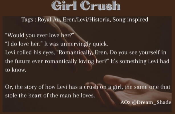 Girl CrushIt is impossible, or so Levi thought, to be so fond of someone that took away everything he ever loved.Or, the story of how Levi has a crush on a girl, the same one that stole the heart of the man he loves.